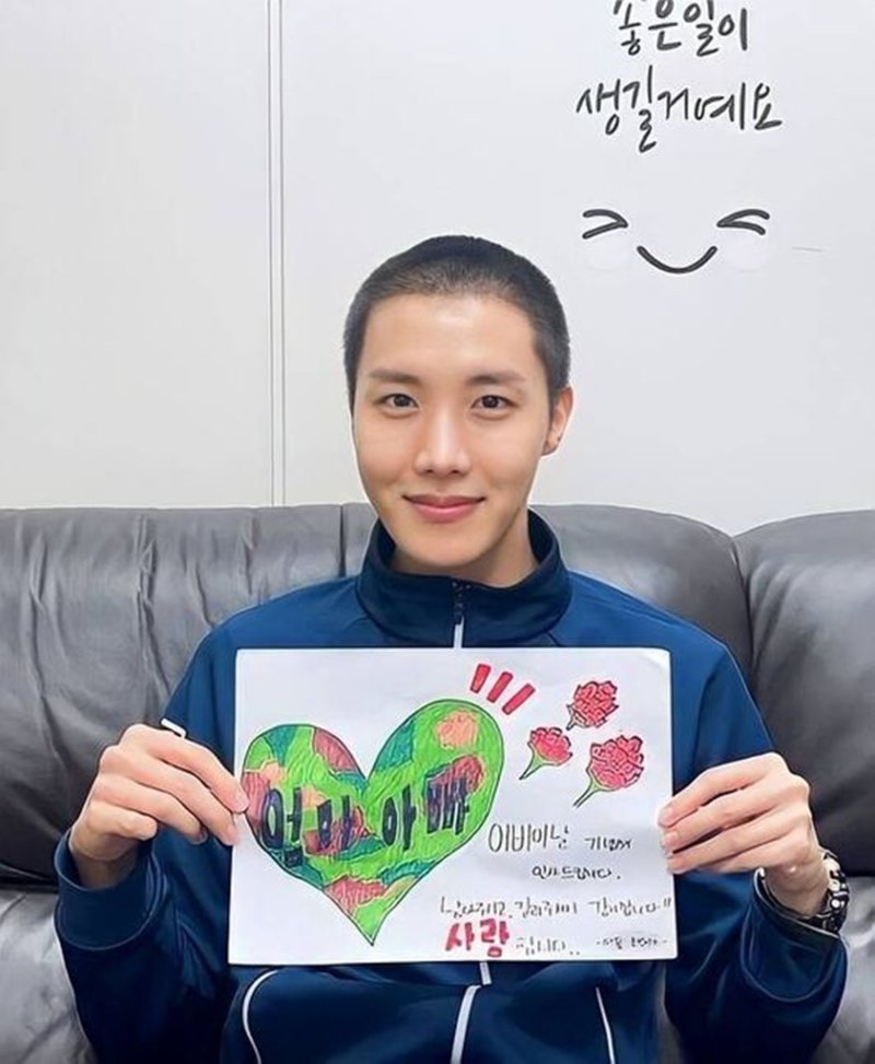 7일 국군 소통 서비스 '더 캠프' 앱에 게재된 어버이날을 맞아 부모님께 전할 편지를 들고 있는 훈련병들의 사진에서 제이홉의 모습이 포착됐다. 손편지를 들고 미소 짓고 있는 제이홉은 편지에서 "어버이날 기념해서 인사드립니다. 낳아주시고 길러주셔서 감사합니다. 사랑합니다"라고 말했다.