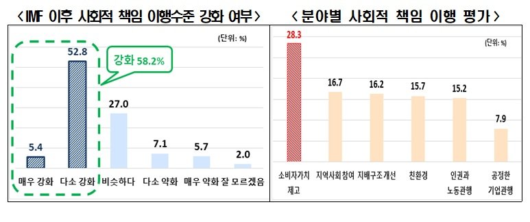 국민 과반은 기업의 사회적 책임 이행 수준이 과거에 비해 높아졌다고 인식하고 있었다. 외환위기 이후 기업의 사회적 책임 이행 수준을 평가하는 질문에 대해 강화(58.2%) 됐다는 답변이 비슷(27.0%), 약화(12.8%) 보다 많았다.