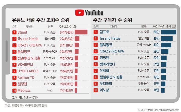 5월 둘째주 튜브가이드 구독자·조회수 순위