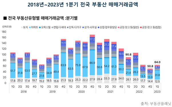 11일 빅데이터 및 인공지능(AI)기반 상업용 부동산 전문기업 부동산플래닛이 국토교통부 실거래가 자료를 기반으로 분석한 2023년 1·4분기 전국 부동산 유형별 매매 거래 특성 리포트에 따르면 올해 1·4분기 전국 부동산 매매 거래량과 거래금액이 전분기 대비 모두 상승한 것으로 나타났다. 전국 부동산 매매 거래량은 1·4분기 23만6406건으로 바로 전분기인 지난해 4·4분기 20만4666건 대비 15.5% 상승했다. 같은 기간 매매 거래금액도 64조59억원으로 직전 분기 50조8054억원과 비교해 26% 증가했다.