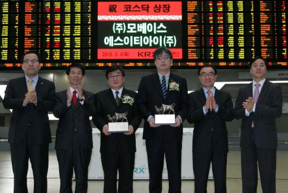 지난 2010년 한국거래소에서 모베이스 등의 상장 기념식이 개최되고 있다. 한국거래소 제공