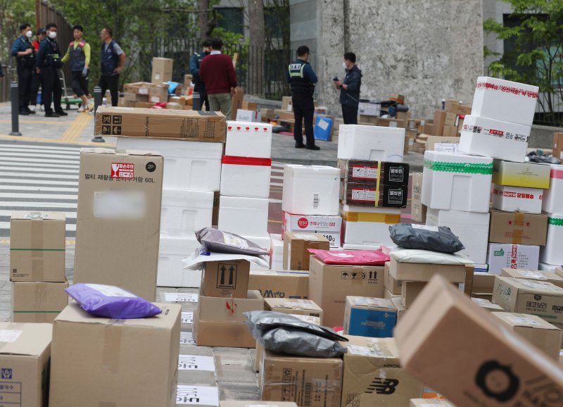 10일 오후 찾은 2586세대 규모의 수원 A아파트 정문에는 이 아파트 입주민들에게 배송된 택배 수백여개가 어지러이 쌓여있었다.