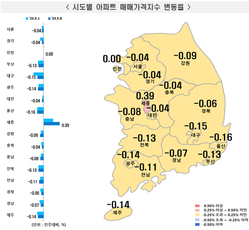4월 첫 주부터 상승세로 돌아선 세종은 0.39% 올랐고 지난주 0.01% 떨어졌던 인천은 하락을 멈췄다. 이로써 전국 아파트 매매가격은 0.07% 떨어져 지난주(-0.09%) 대비 하락폭이 축소됐다.