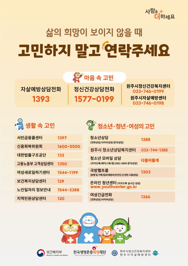 센터 관계자는 “겨울철에 상대적으로 낮았던 자살률은 매년 3~5월에 약 20%까지 증가하는 경향이 있다”면서 “다양한 홍보로 더 많은 분이 도움을 받도록 최선을 다하겠다”고 전했다.