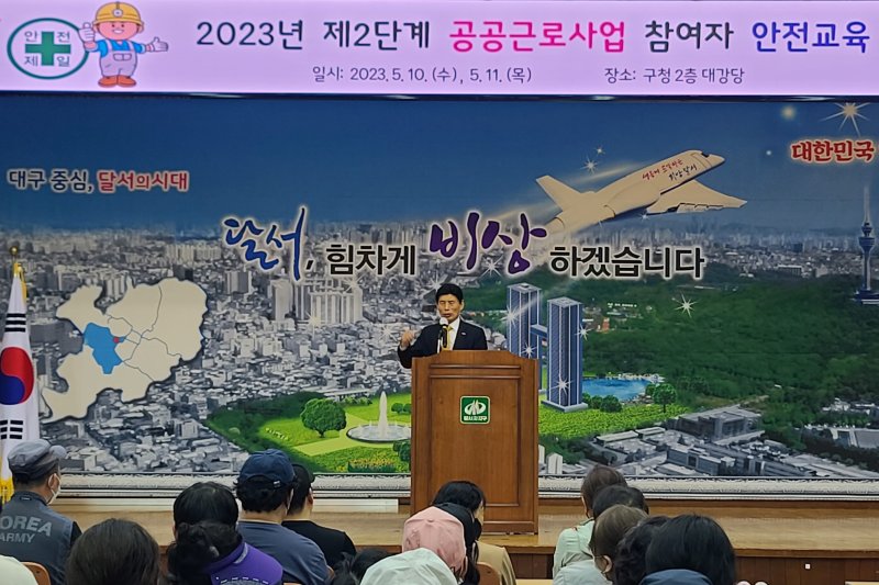 [대구=뉴시스] 이상제 기자 = 대구시 달서구는 2023년 '대구형 희망플러스 일자리사업(공공근로)' 2단계 참여자 300명을 대상으로 안전보건교육을 실시했다고 12일 밝혔다.