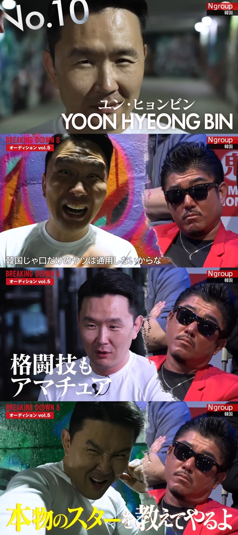 지난 11일 유튜브에서 공개된 '브레이킹 다운' 시즌8 5회에서는 '브레이킹 다운'에 출전한 한국 선수들이 밝혀졌고, 윤형빈은 한국 예능계 최강 파이터로 소개됐다. 반에게 도전장을 내민 윤형빈은 "한국은 입만 살아있는 사람을 싫어한다. 나는 격투도 프로, 개그도 프로다. 진짜 프로가 뭔지 보여주겠다"고 강조했다.