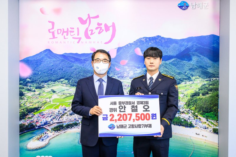 경남 남해군은 남해읍 출신 안철오 경위가 첫 월급 전액 220만7500원을 고향사랑기부금으로 전달했다고 16일 밝혔다.