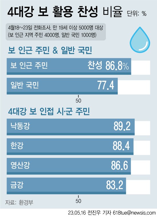 보 인근 주민 3473명이 보 활용을 지지해 찬성 비율은 86.8%였다. 일반 국민의 찬성 비율인 77.4%(774명)보다 훨씬 높았다.