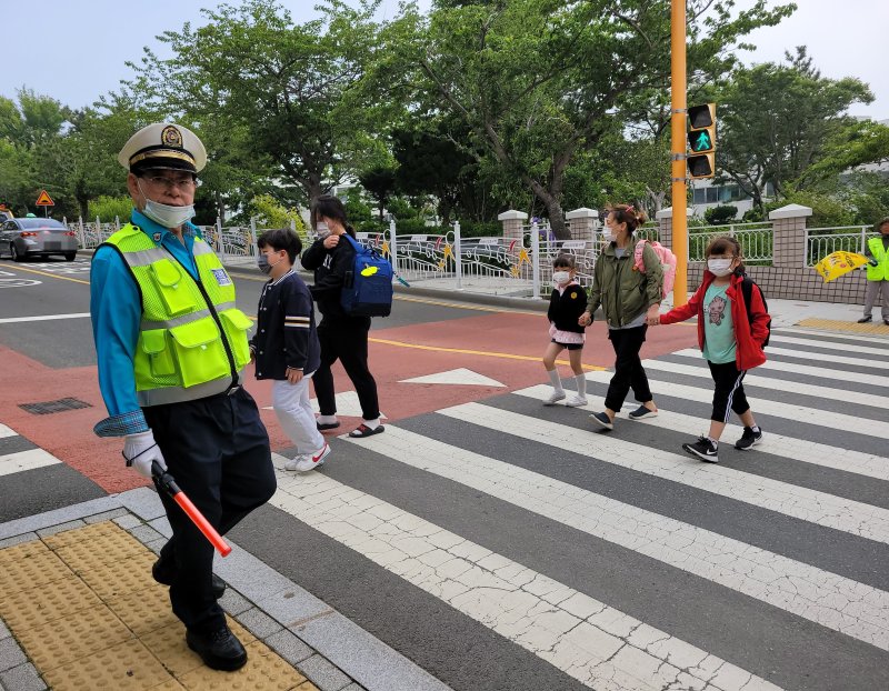 학교 앞 횡단보도에서는 푸른색 유니폼 위에 형광색 조끼를 껴입고 정모까지 착용한 모범운전자들이 교통 안전 활동에 한창이었다.