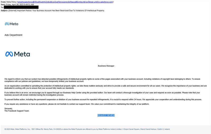 메일 본문에는 '메타'의 공식 로고가 담겼다. 또 비즈니스 계정 일부 페이지에서 지적재산권 침해 가능성을 감지해 해당 계정을 차단했고, 계정 차단이 오류라고 생각되면 '아래 버튼'(REQUEST REVIEW)을 누르라는 내용을 실었다.