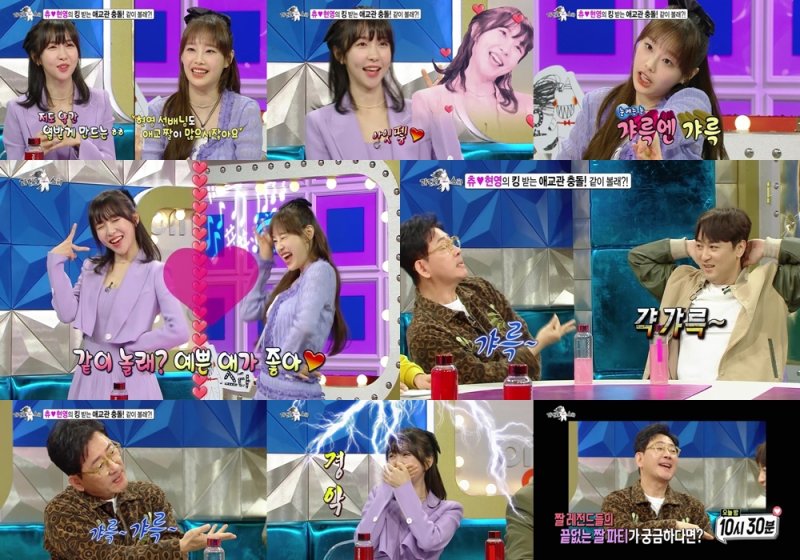 특히 애교를 계속 주고받던 중 주현영이 자신의 세계관 필살기 "갸루!"를 날렸고 츄 또한 "갸루!"로 받아쳐 녹화장을 초토화시켰다. 그러더니 두 사람은 "짱 예쁘다~ 같이 놀래? 예쁜 애가 좋아!"라며 킹 받는 애교 호흡을 선보였다.