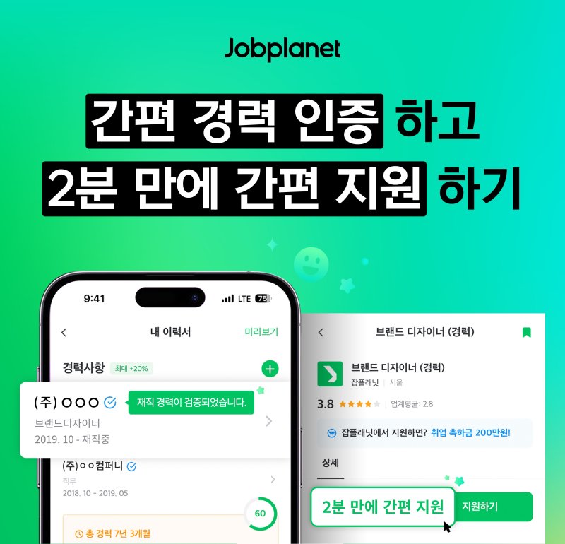 이력서 작성을 보다 빠르고 안전하게 할 수 있는 '경력 간편 인증' 기능을 활용해 입사 지원 과정을 대폭 간소화했다. 이 기능은 잡플래닛에 채용 공고를 게재한 모든 기업에 적용된다. 이력서 작성부터 지원 완료까지 2분 이내로 마무리된다.
