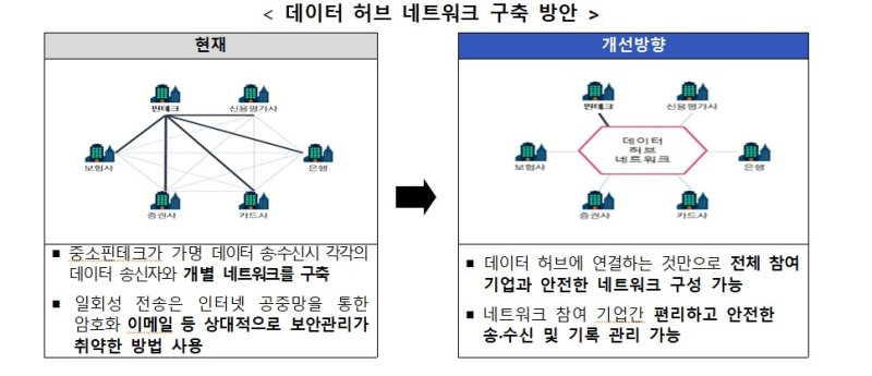 전송이력 관리 등 보안기능을 갖춘 '데이터 허브 네트워크' 구축도 검토한다. 현행법에 따라 가명데이터 유통시 수요자와 공급자가 각각 보안 기준을 충족하는 네트워크를 구축해야 한다. 하지만 중소 핀테크의 경우 비용 문제로 이러한 네트워크의 구축이 쉽지 않아 데이터 거래와 가명데이터 활용에 어려움을 겪고 있다.