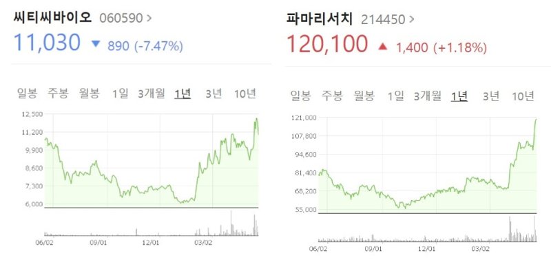씨티씨바이오뿐 아니라 파마리서치 주가 역시 급등세다.