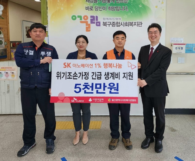 SK이노베이션 울산CLX는 18일 울산 북구종합사회복지관에서 지역 위기 조손 가정에 긴급 생계비 지원성금 5000만원을 전달했다.