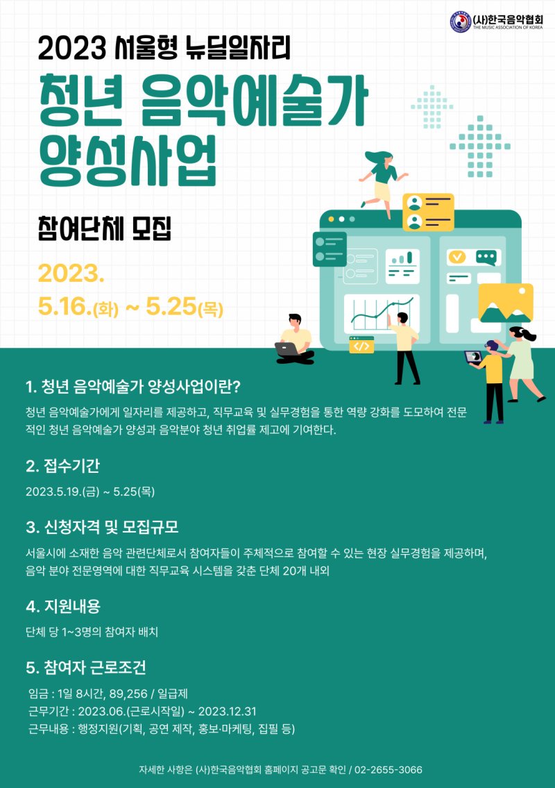 [서울=뉴시스] 박주연 기자 = 한국음악협회가 오는 25일까지 '2023 청년 음악예술가 양성사업' 참여자와 참여단체를 모집한다.