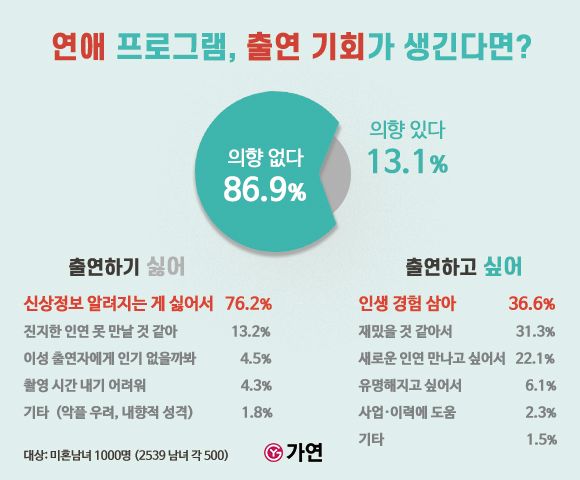 ‘출연 의향이 없는 이유’는 ‘신상정보가 알려지는 게 싫어서(76.2%)’가 1위로 꼽혔다. ‘진지한 인연을 만날 수 있을 것 같지 않아서(13.2%)’, ‘이성출연자에게 인기가 없을까 봐(4.5%)’, ‘촬영 시간을 내기가 어려워서(4.3%)’, ‘기타(1.8%)’ 순이었고, 기타는 ‘활발한 성격이 아님’, ‘악플을 받을까 봐’ 등을 들었다.
