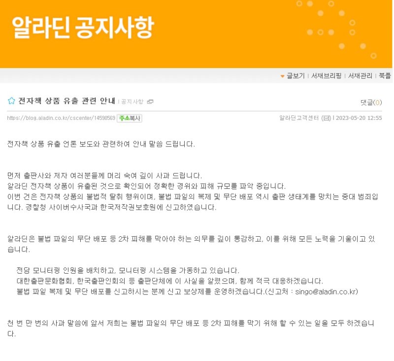 20일 알라딘은 최우경 대표 명의로 자사 공지사항을 통해 "알라딘 전자책 상품이 유출된 것으로 확인돼 정확한 경위와 피해 규모를 파악 중"이라며 "이번 건은 전자책 상품의 불법적 탈취 행위이며, 불법 파일의 복제 및 무단 배포 역시 출판 생태계를 망치는 중대 범죄"라고 전했다.