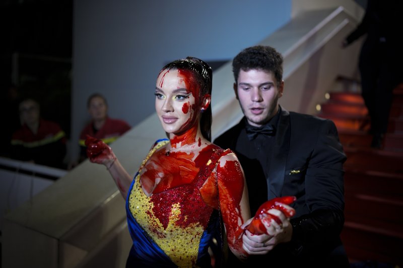 이 여성은 21일(현지시간) 프랑스 남부 칸에서 열린 제76회 칸 국제영화제 '애시드' 시사회장 앞에서 붉은색 액체가 담긴 주머니를 꺼내 자신의 머리에 뿌렸다. 현장에 있던 보안 요원들은 이 여성을 레드카펫 밖으로 끌어냈다.