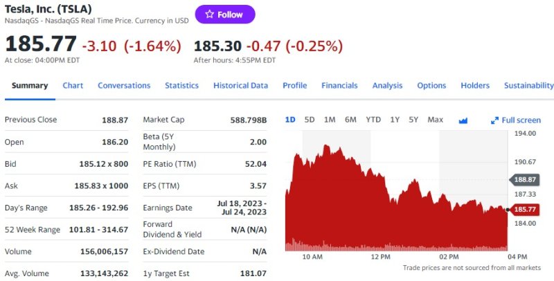 23일(현지시간) 뉴욕증시에서 테슬라는 전거래일보다 1.64% 하락한 185.77 달러를 기록했다.
