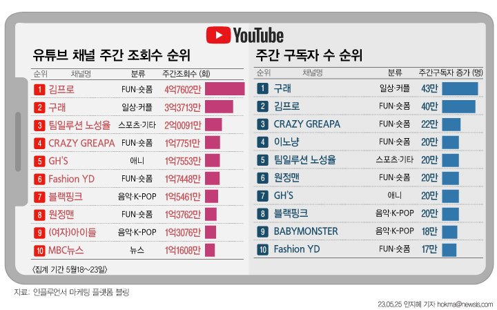 주간 조회수 1~10위는 ▲김프로(4억7602만회) ▲구래(3억3713만회) ▲팀일루션 노성율(2억91만회) ▲크레이지 그레빠(1억8554만회) ▲계향쓰(1억7553만회) ▲패션YD(1억7448만회) ▲블랙핑크(1억5461만회) ▲원정맨(1억3762만회) ▲(여자)아이들 공식 채널(1억3076만회) ▲MBC뉴스(1억1608만회)로 집계됐다.