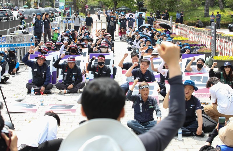 금속노조와 '비정규직 이제그만' 공동투쟁 등은 이날 오후 2시부터 서울 중구 대통령실 앞에서 주최 측 추산 200여명이 참석한 '투쟁 결의대회'를 열었다.