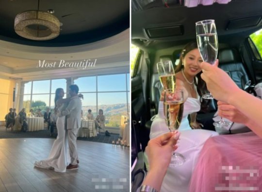 송단아는 29일 인스타그램에 미국 샌프란시스코에서 웨딩드레스를 입고 신랑과 찍은 사진을 올렸다. 리무진 안에서 지인들과 샴페인 잔을 들고 있는 모습도 공개했다. 특히 그의 친오빠인 그룹 위너 멤버 송민호의 모습도 담겼다.