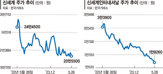 29일 한국거래소에 따르면 신세계와 신세계인터내셔날의 주가는 최근 1년 동안 각각 15.95%, 46.13% 하락했다. 특히 신세계인터내셔날은 지난 26일 장중 1만8250원으로 5년래 최저가를 기록했다.