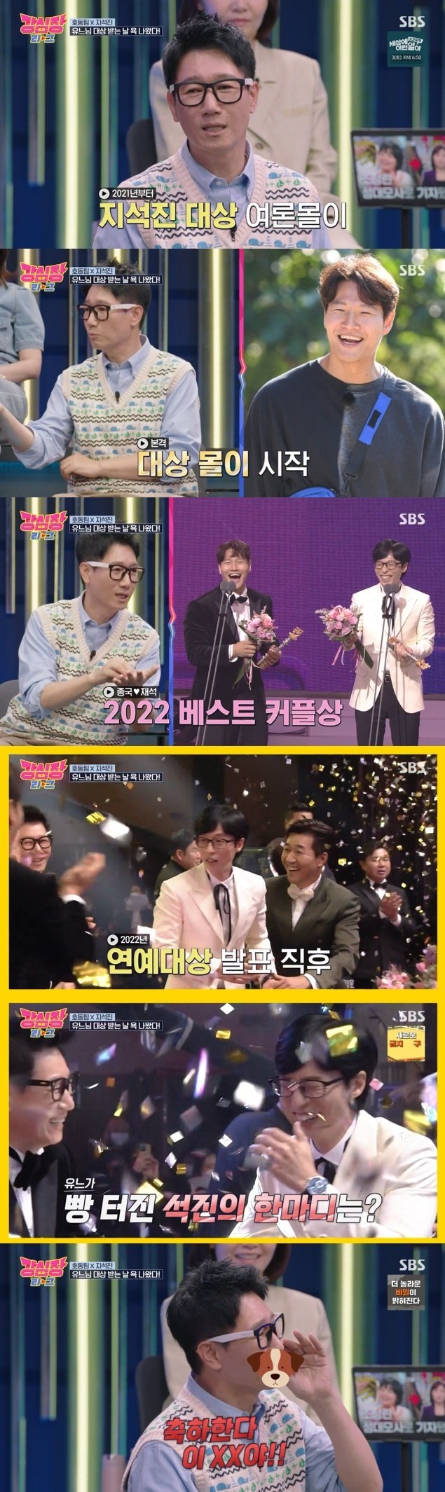 지석진은 "대상 수상자를 보면 그날 상을 두 개 받는 사람은 흔치 않다. 그게 처음 날아간 사람이 재석이다. 베스트 커플상을 종국이랑 받았다"라면서 "결국 안 받은 사람이 나랑 탁재훈, 신동엽씨였다. 그리고 대상 직전에 PD상이 호명됐는데 탁재훈이었다"라고 전했다.