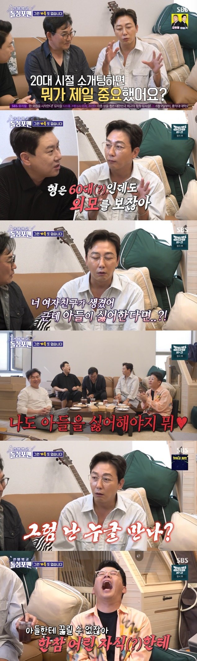 그러자 탁재훈은 "그럼 아들이 싫어한다고 여자친구한테 그만 만나자 그래?"라면서 "어렸을 때는 엄마가 싫어한다고 못 만나고, 지금은 아들이 싫어한다고 못 만나고, 그럼 누굴 만나?"라고 강조했다.