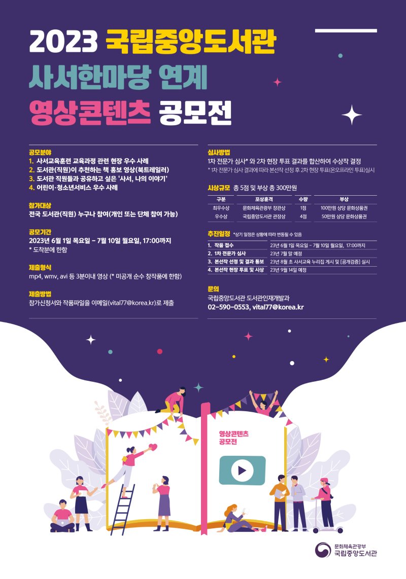 (서울=뉴스1) 김정한 기자 = 문화체육관광부 국립중앙도서관은 6월1일부터 7월10일까지 '2023 사서한마당 연계 영상콘텐츠 공모전'을 개최한다. 전국 도서관 직원들의 교육훈련 성과를 공유하고 우수한 교육 콘텐츠를 발굴하기 위한 행사다.