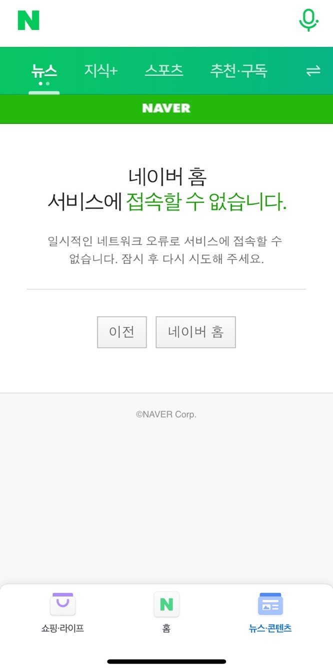 이날 네이버에 따르면 오전 6시43분부터 6시48분까지 약 5분간 네이버 모바일 버전에 접속하면 ‘일시적인 네트워크 오류로 서비스에 접속할 수 없습니다. 잠시 후 다시 시도해 주세요.’라는 문구가 뜨는 접속 오류가 발생했다.