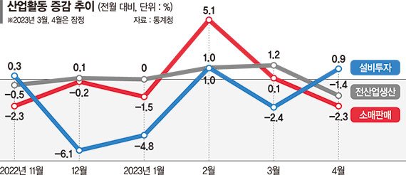 최근 비교적 강한 흐름을 보였던 생산활동은 다시 꺾였다. 전산업 생산은 지난해 10월(-1.1%), 11월(-0.5%) 내림세를 보이다가 12월(0.1%), 1월(0.0%), 2월(1.0%) 3월(1.2%) 상승세를 기록했으나 5개월 만에 하락세로 전환했다.