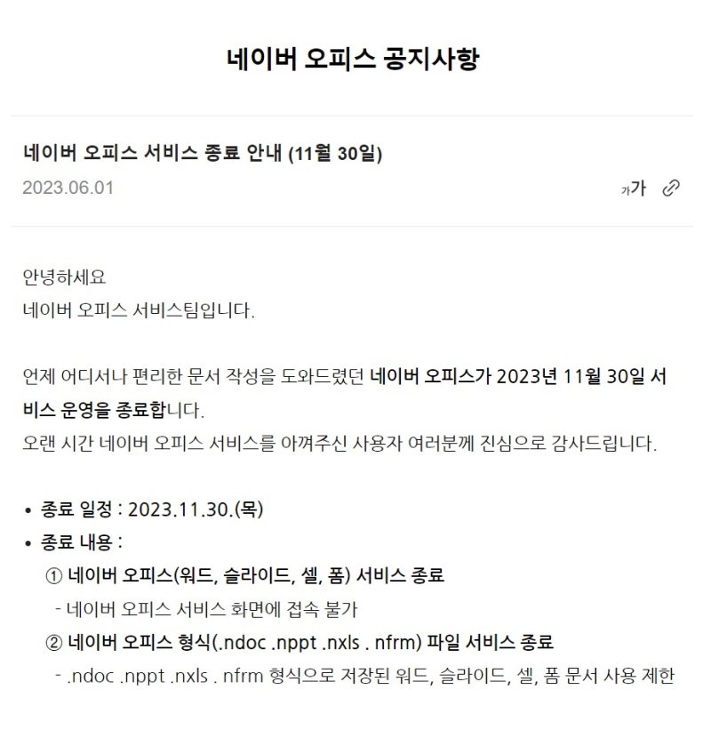 이번 서비스 종료에 따라 △네이버 워드 △네이버 슬라이드 △네이버 셀 △네이버 폼 △네이버 오피스 전용 형식(.ndoc .nppt .nxls . nfrm) 파일 서비스도 끝난다.