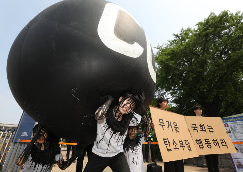 그린피스와 빅웨이브, 기후변화청년단체GEYK, 대학생신재생에너지기자단 회원들은 5일 서울 여의도 국회 앞에서 기후 위기 대응 촉구하는 '탄소의 짐' 퍼포먼스를 펼쳤다.