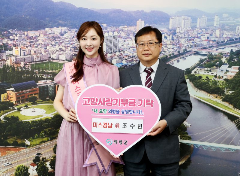 경남 의령군은 미스경남 진에 선발된 조수빈씨가 고향사랑기부금 100만원을 전달했다고 5일 밝혔다. 조씨는 지난 4월 25일 미스코리아 지역 예선 미스경남 선발대회에서 미스경남 진에 선발된 바 있다.