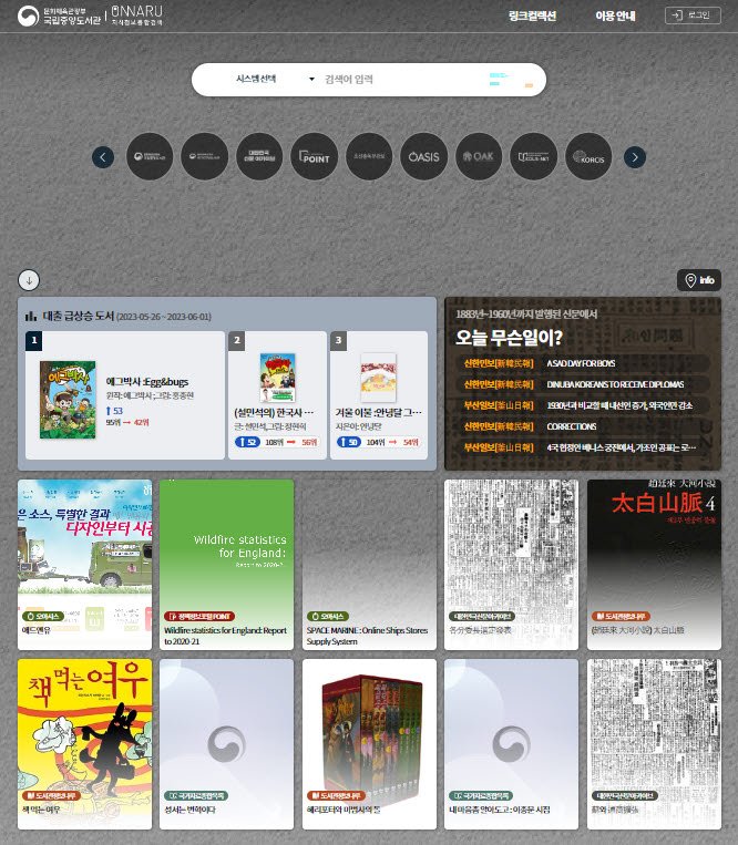 통합검색 대상인 국립중앙도서관 시스템은 국립중앙도서관 누리집, 국가전자도서관, 대한민국신문아카이브, 정책정보포털 POINT, 조선총독부관보, OASIS, Open Access Korea, 국가자료종합목록, 한국고문헌종합목록, Linked Open Data, 도서관정보나루, ISNI-Korea 등이다.