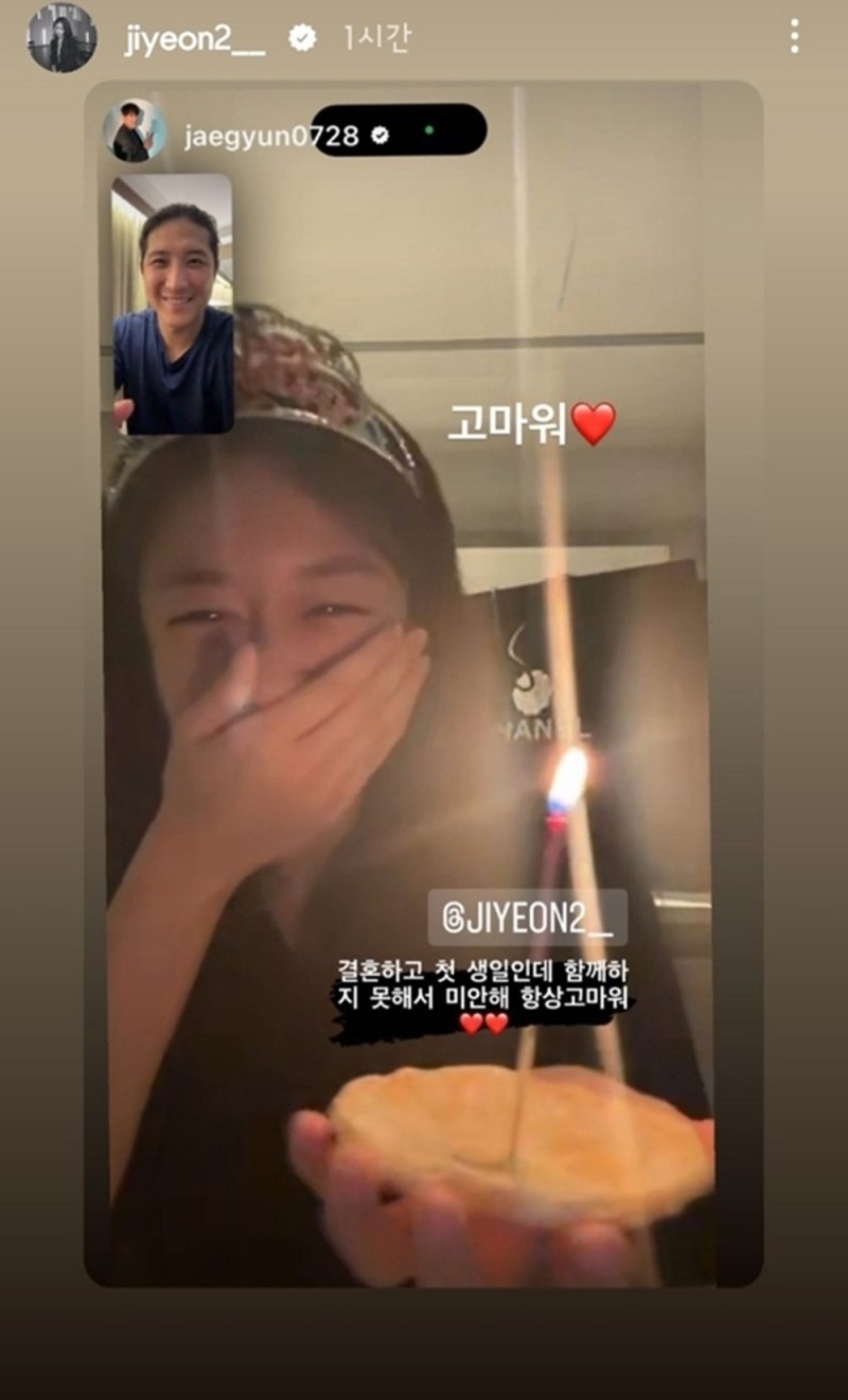 지연은 7일 자신의 소셜미디어에 "고마워♥ 결혼하고 첫 생일인데 함께하지 못해서 미안해. 항상 고마워♥"라고 적었다. 함께 공개한 사진에는 야구선수 황재균과 영상 통화 중인 지연의 모습이 담겼다. 티아라를 쓴 지연은 입을 틀어막으며 행복한 표정을 짓고 있다. 아울러 지연은 "행복하구만♥"이라는 글과 함께 사진을 올리며 생일을 자축했다.