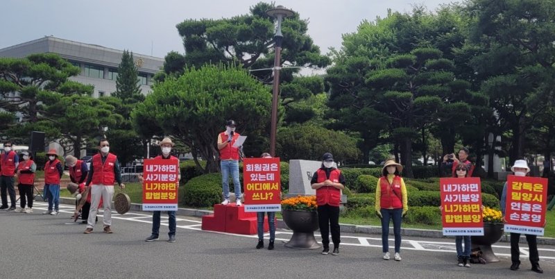 밀양 에스파크골프리조트 회원협의체 회원 130여명은 8일 밀양시청 앞에서 골프부킹 정상화와 리조트 공사 착공 등을 촉구했다.