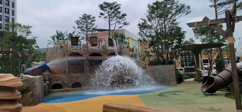 공언한 대로 커뮤니티 시설은 보통의 아파트와 달랐다. 부출입구 옆 위치한 놀이터에선 바스켓 모양의 조형물이 시원한 물을 쏟아냈다. 바닥에는 경사로를 만들어 아이들이 물놀이를 할 수 있도록 했다.