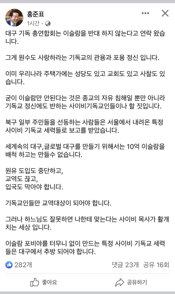 이어서 "세계 속의 대구, 글로벌 대구를 만들기 위해서는 10억 이슬람을 배척하고는 만들 수 없다"며 "이슬람 포비아를 만드는 특정 사이비 기독교 세력을 대구에서 추방해야 한다"고 했다.