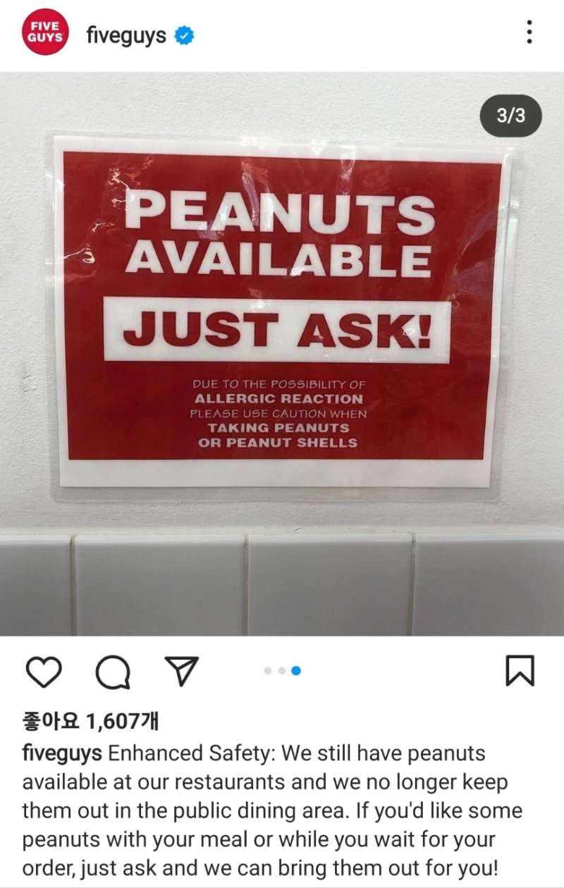 우선 '무료 땅콩' 리필 서비스 도입이 확정됐다. 미국 파이브가이즈는 땅콩을 무제한으로 제공하는 것으로 잘 알려져 있다.