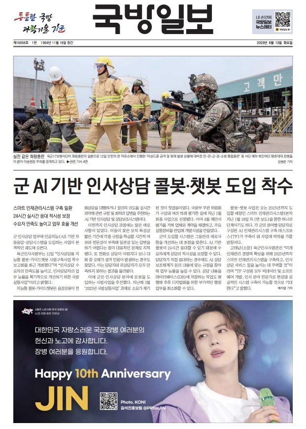 국방부 산하 국방홍보원 소속 국방일보는 오늘(13일)자 1면 하단 광고에 김석진 일병이 마이크를 쥐고 있는 사진을 게재했다.
