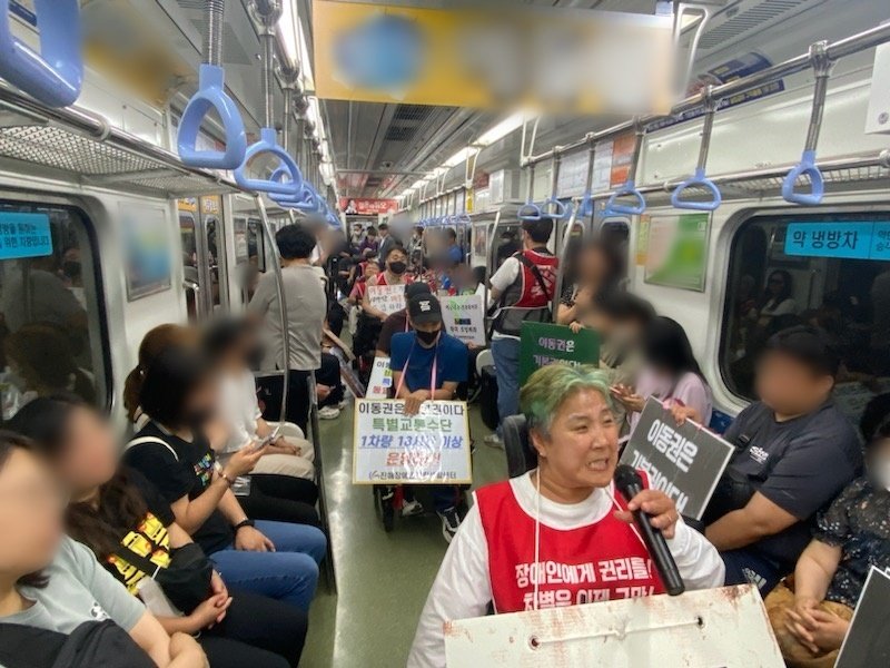 이날 전장연은 ‘장애인 이동권 보장 결의대회’ 집회 장소인 부산시청으로 이동하기 위해 부산 지하철에 탑승했다.