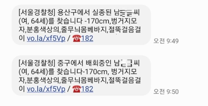 실종경보 문자메시지는 실종된 아동 등의 신상정보와 인상착의를 지역 주민들에게 오전 7시부터 오후 9시 사이 안전안내 문자와 같은 방식으로 전송하는 제도다. 보호자가 희망하는 경우, 상습적 가출이 아닌 경우, 생명·신체 등 위험 우려가 있다고 판단될 경우 등에 이뤄지는데, 필요에 따라 '절뚝 걸음걸이' 등 구체적인 특징도 함께 담아 발송한다.