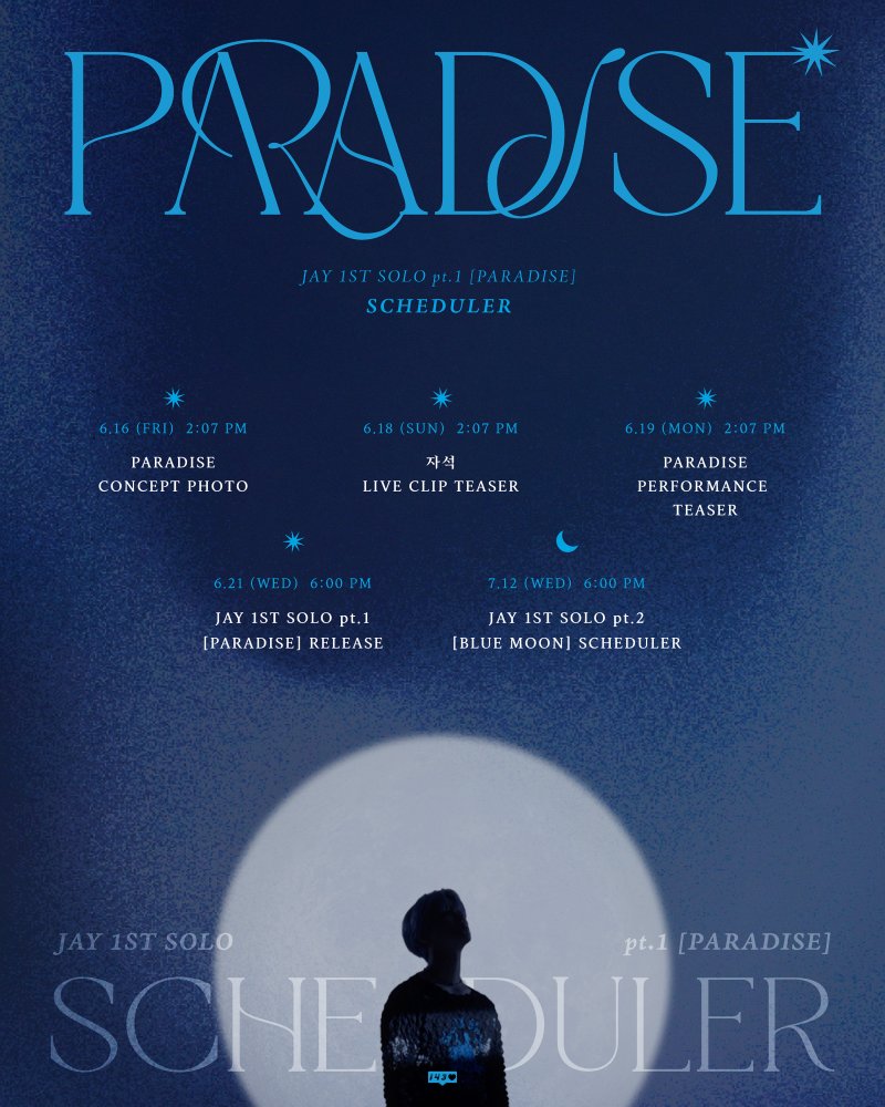특히 스케줄러 속 '7. 12 (WED) 6:00PM', '제이 퍼스트 솔로 파트 투 블루 문(JAY 1ST SOLO pt.2 BLUE MOON) SCHEDULER' 타이포그래피는 김진환의 첫 번째 솔로 앨범 프로젝트가 약 1개월간 파트 1과 파트 2로 나뉘어 진행되는 걸 알려 팬들의 기대를 모은다.