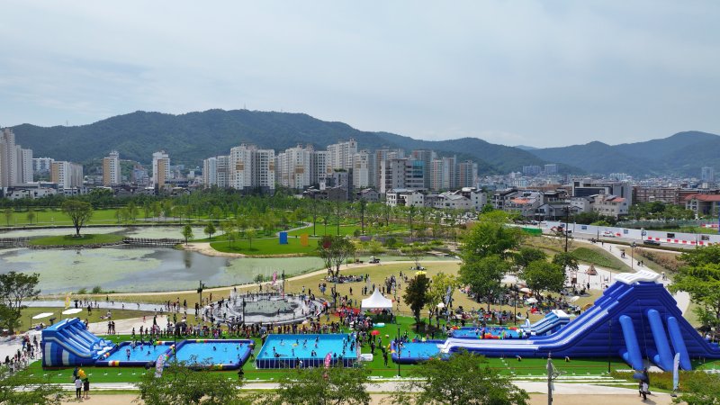 순천 오천그린광장에 마련된 '워터아일랜드'는 연면적 1만㎡ 규모로 조성됐으며, 어린이를 동반한 가족이면 누구나 무료로 즐길 수 있다.