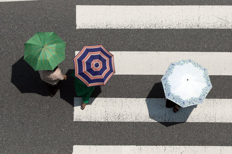 이날 부산 지역의 자외선 지수는 '높음' 수준을 나타냈다. 시민들은 따가운 햇볕을 피하기 위해 우산을 쓴 채 이동했다.