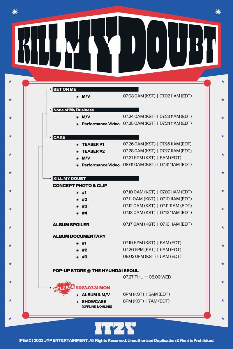 있지는 20일 0시 공식 사회관계망서비스(SNS) 계정에 신보 '킬 마이 다웃' 프로모션 스케줄러를 공개했다. 이에 따르면 타이틀곡 '케이크'(CAKE)를 비롯한 총 세 편의 뮤직비디오 공개, 팝업 스토어 운영, 온오프라인 쇼케이스를 진행한다.