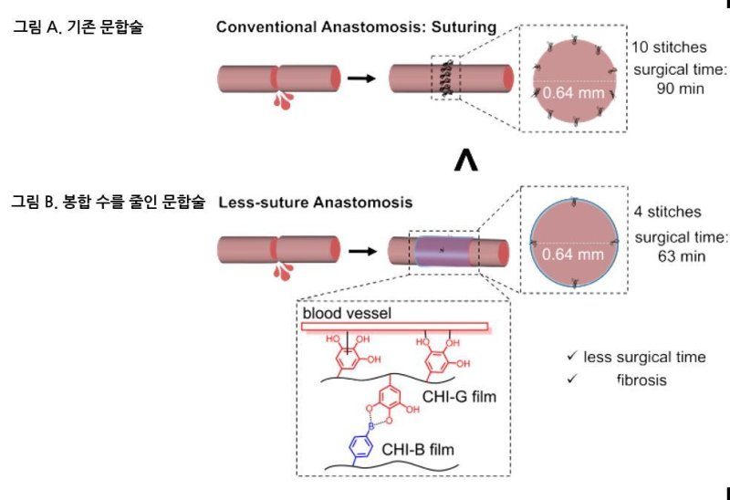 키토산-붕산 소재의 필름은 문합 부위에 첫 번째 부착되는 ‘키토산-갈롤 소재의 필름’과 습식 융합해 전체 필름의 강도를 높였으며, 이로써 혈관이 재생될 때까지 필름이 충분히 부착돼 생체 소재의 효능을 최대화 했다.